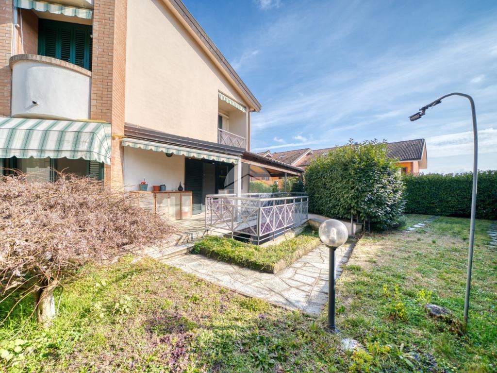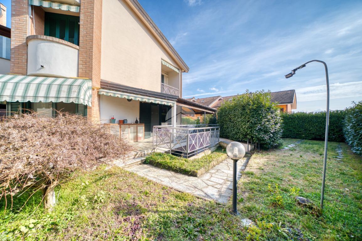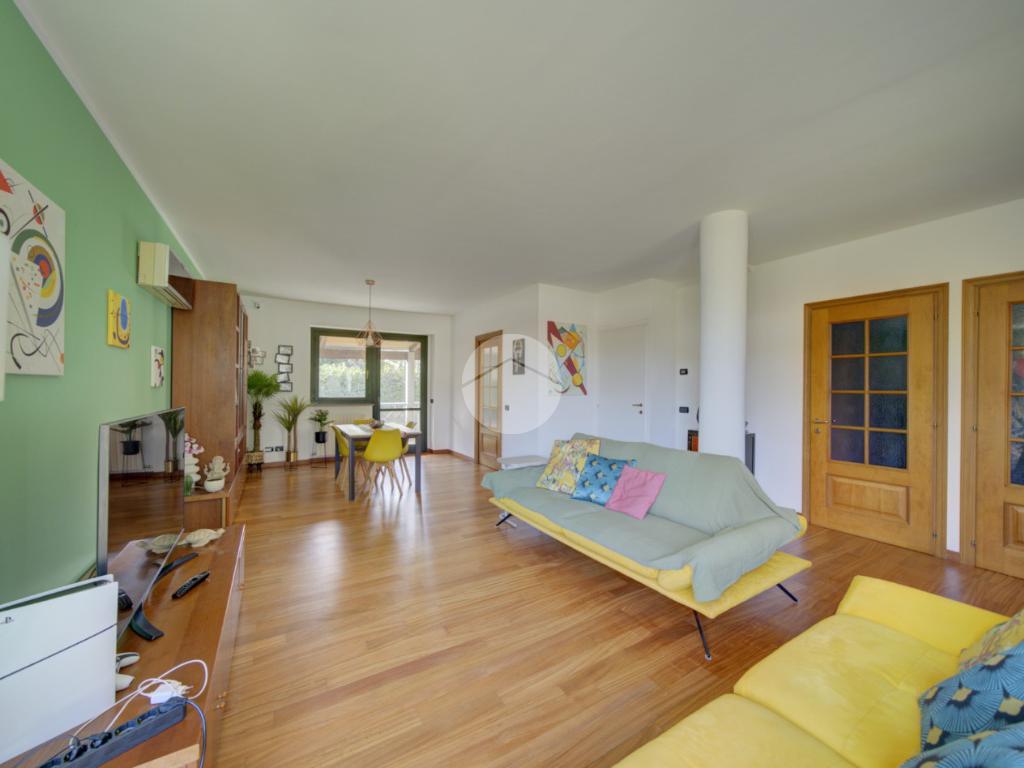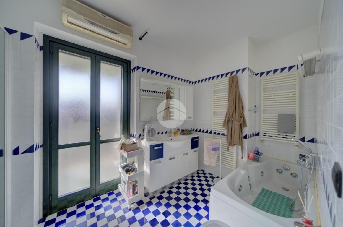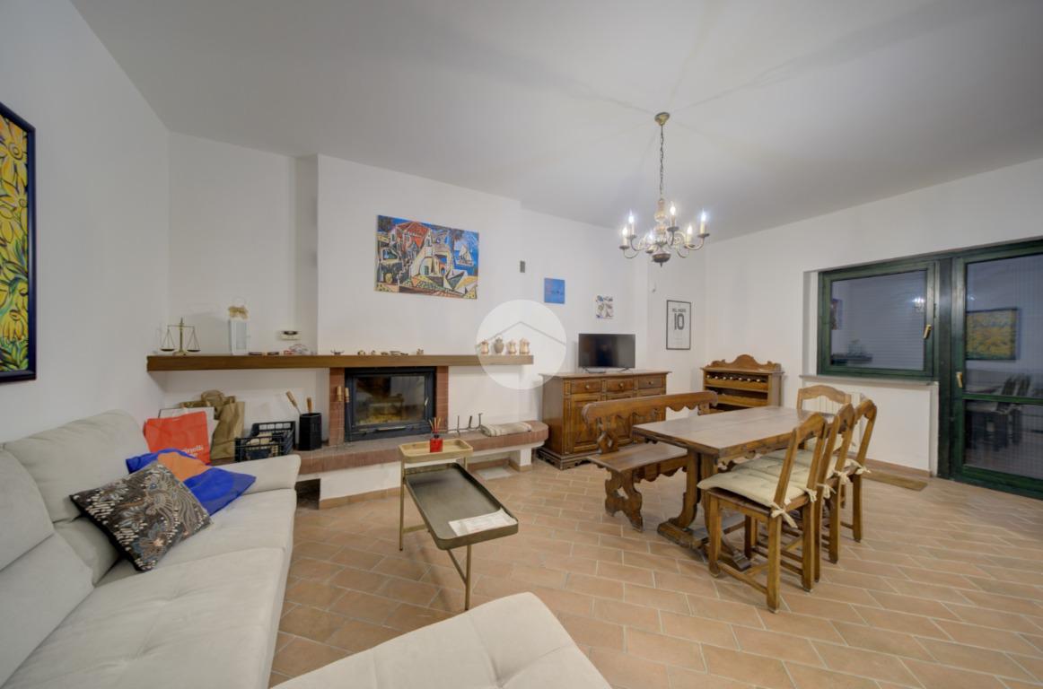 Il piano terra è composto da un elegante salone di generose dimensioni con parquet e climatizzatore, e una cucina abitabile, dai quali si può accedere al porticato e all’ampia area esterna che circonda la soluzione. Completano il piano un bagno di servizio ed un ripostiglio.